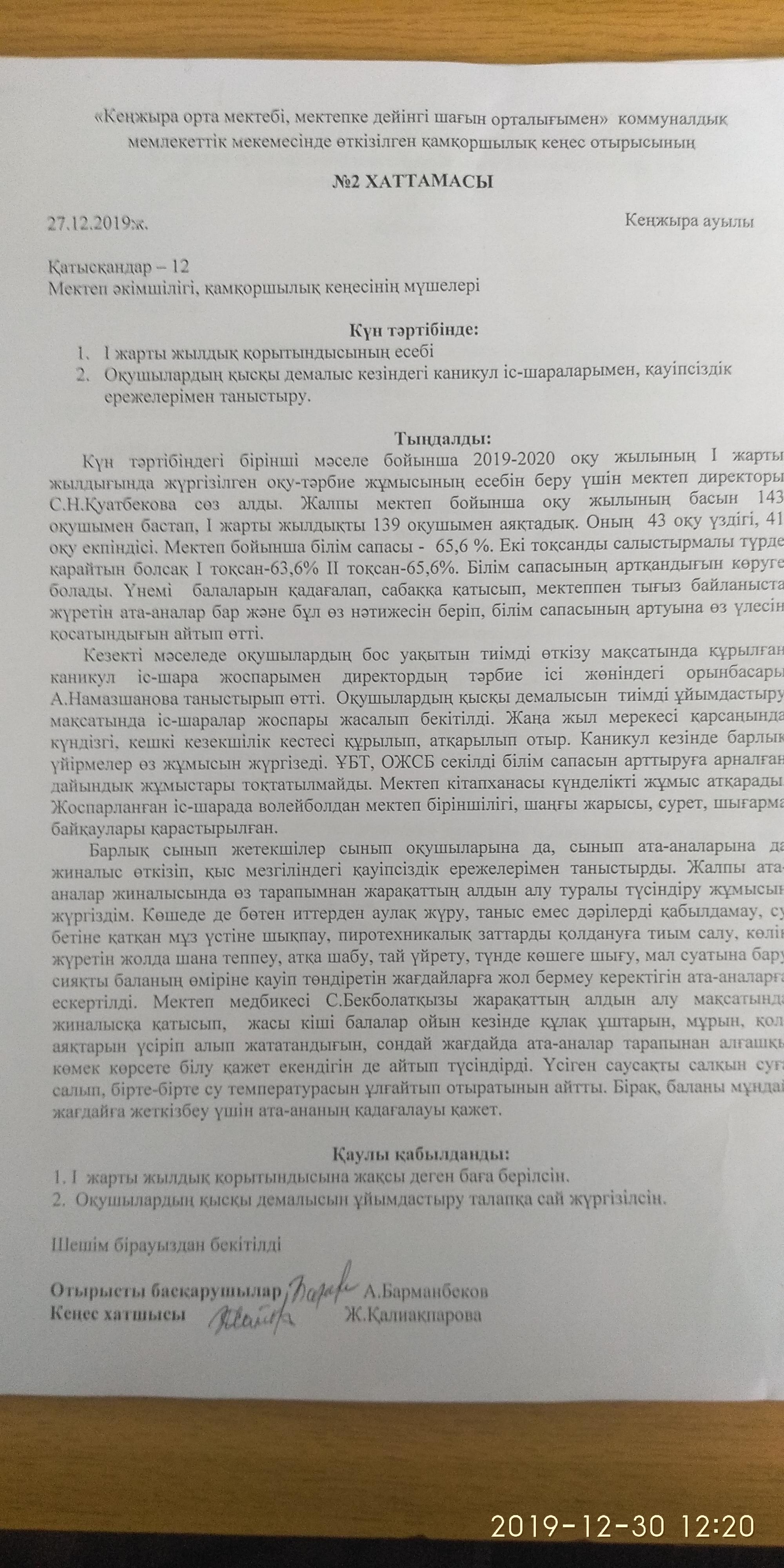 Қамқоршылық кеңес отырысы » «Кеңжыра орта мектебі, мектепке дейінгі шағын орталығымен» коммуналдық мемлекеттік мекемесі