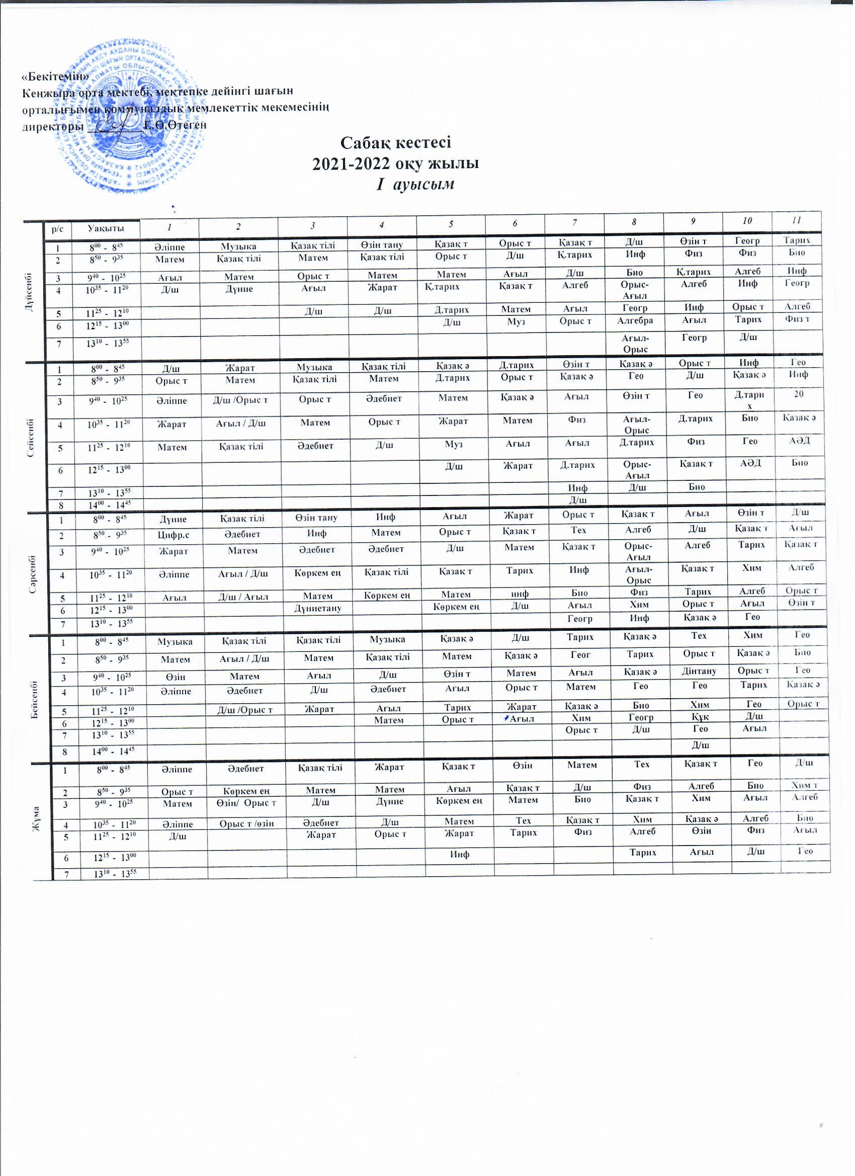 Сабақ кестесі 2021 - 2022